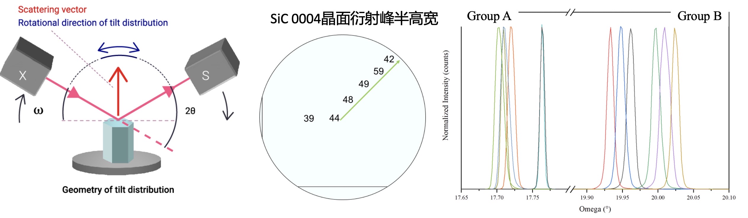 通过测量X射线摇摆曲线,获得衬底或者晶体某一晶面的衍射峰强度和角度分布,根据衍射信号半峰宽的大小来判定晶面间距的一致性,进而判定结晶质量。