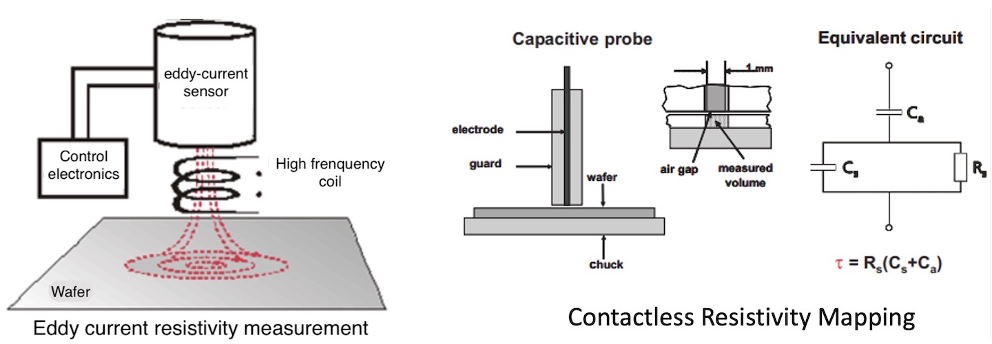 导电型碳化硅的电阻率是通过涡流法进行检测的,导电线圈在导电衬底上形成涡流,涡流产生磁场变化被传感器侦测到,可以计算出衬底的方块电阻,涡流的检测原理如下左图所示;半绝缘型碳化硅的电阻率是通过电容探针法进行检测的,在衬底上施加电压的瞬间,通过侦测电荷的变化,来计算衬底的电阻率,该检测原理如下图所示