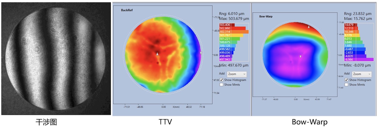 利用碳化硅衬底上下表面与光相互作用的干涉图案,可以分析碳化硅衬底的厚度变化(TTV和LTV),衬底的翘曲度(warp)和弯曲度(bow)等重要的衬底面型指标。