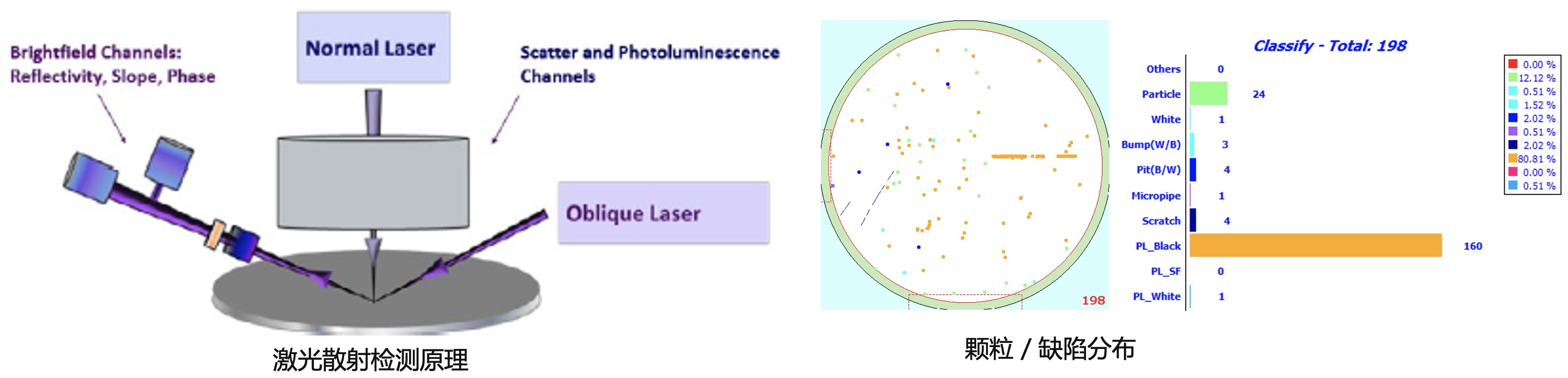 利用激光在衬底表面的散射,可以分析衬底表面上的颗粒大小和缺陷形态,通过激光对衬底表面的面扫描,可以获得衬底上颗粒和缺陷的面分布情况,同时在光致发光(PL)功能模块的帮助下,可以进一步分析衬底内部的缺陷复合中心,为衬底质量评估提供更全面的信息。