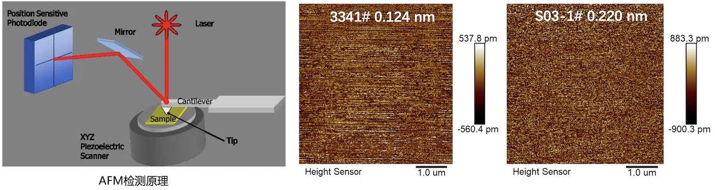 通过原子力探针(AFM)的快速敲击和扫描衬底表面,获得表面相关的纳米级别的高低起伏等信息,提供衬底表面粗糙度的定量分析。